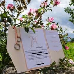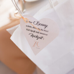 Von Anfang bis Ende zog sich bei der Sommerhochzeit am 22.07.2017 die Farbe apricot durch jedes noch so kleine Detail. Viel Herzblut steckte bereits in der liebevoll selbstgemachten Papeterie, bestehend aus Save-the-Date-Karte, Pocketfold-Einladungskarte, Menükarten, Kirchenheften, Freudentränen-Taschentüchern, Willkommensschild, Wegweiser-Schildern, Bar-Beschriftung und den Dankeskarten. Hier wurde besonders viel Wert auf ausgefallene kleine Details, wie die selbst gelaserten Bleistifte und gravierten Ringe mit Hochzeitslogo und -datum geachtet.