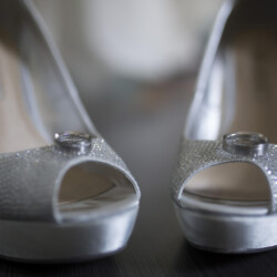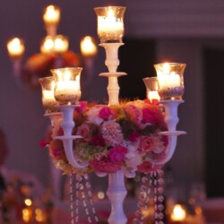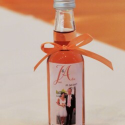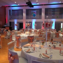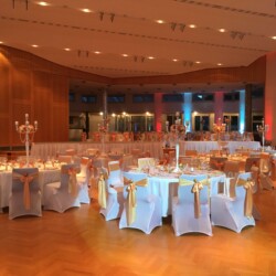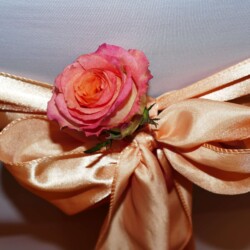 Elegant, glitzernd und mit vielen Blumen sollte die Dekoration werden. Unsere großen weißen Kerzenständer mit wunderschönen, frischen, sommerlichen Blumenkränzen verliehen dem großen Saal eine ganz besondere Atmosphäre und störten dabei aber nicht die Gespräche an den runden Banketttischen, da sie oberhalb der Augenhöhe waren. Mit liebevollen Details, wie den Gastgeschenk-Likören mit Foto und Hochzeitslogo, den Überraschungstüten für die kleinen Gäste, viel glänzender Streudeko, einer echten Rose an jeder Stuhlschleife und vielen Windlichtern mit Kerzen wurde der Raum richtig festlich.